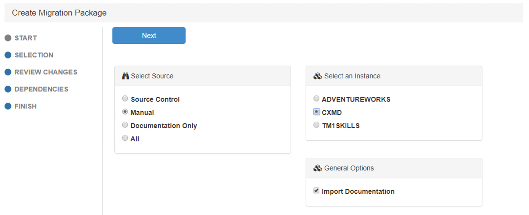 The first step when creating a migration package is to choose the method. The All package will enable you to include all TM1 objects. This method can be used to compare two instances. With the Documentation Only, Pulse will migrate the documentation input in Pulse. By choosing the Manual method, Pulse enables you to select manually the TM1 objects you want to migrate. The Source Control method allows you to query for a list of changes based on a date range and also by developer/user (leave this blank for all users) and then select the items you want to migrate.
