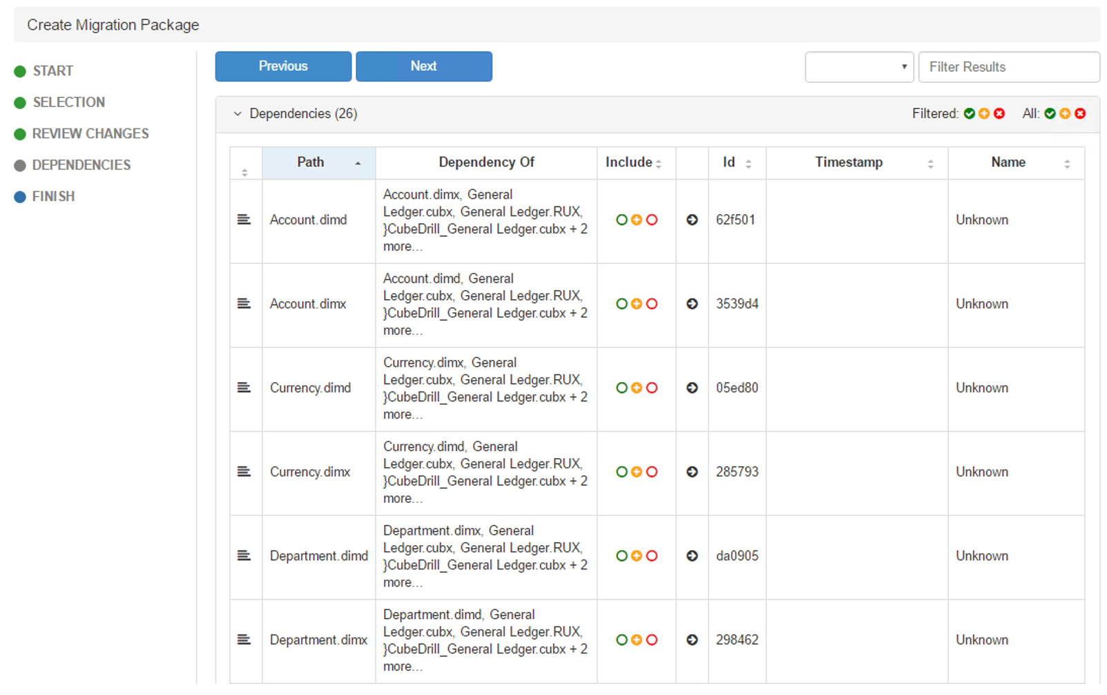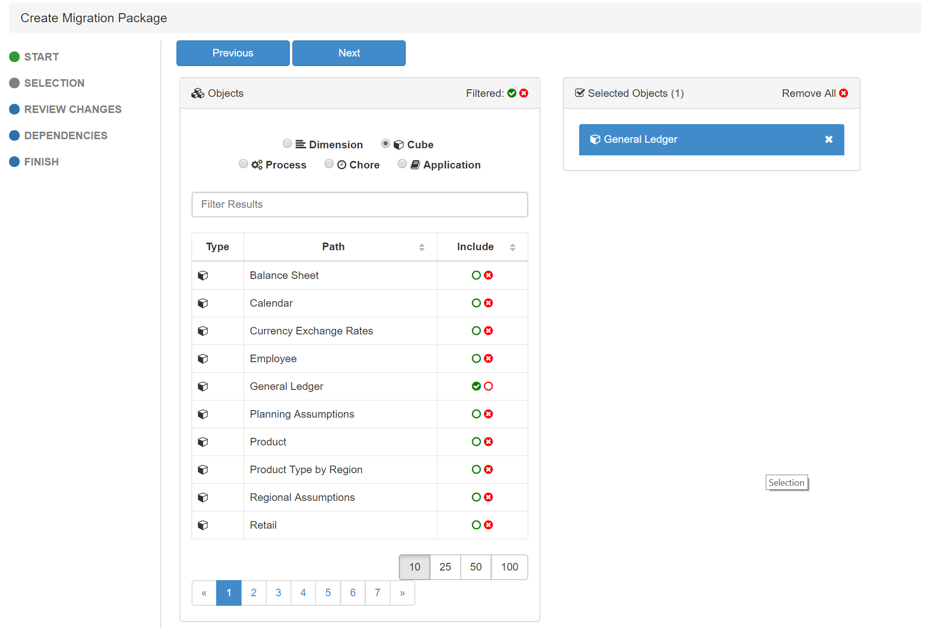 What is more here is that you don’t need to worry if you missed one object, Pulse will include all dependencies into the package. For example, if you want to migrate the General Ledger cube, just select the cube and Pulse will add the rule file, all dimensions and attributes.