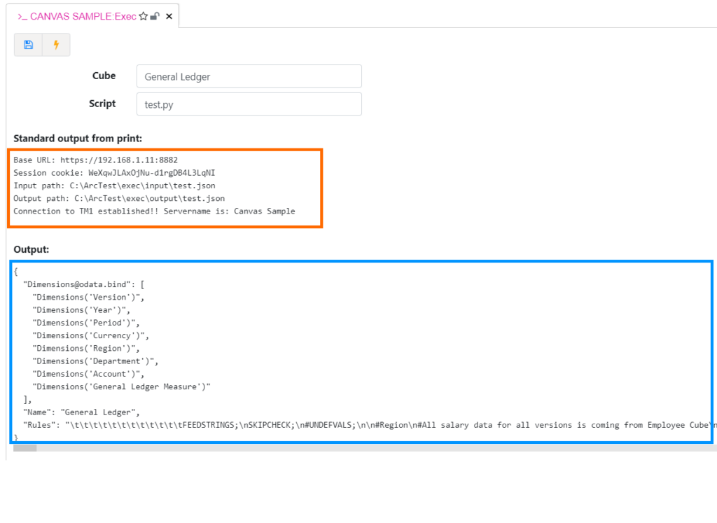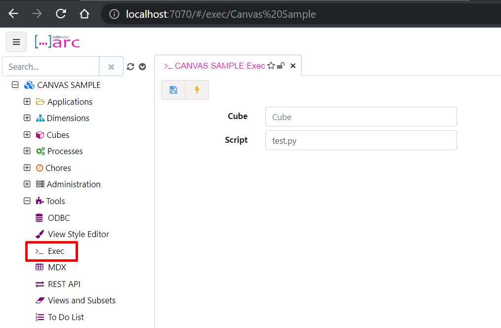 This application takes two parameters Cube name in the TM1 model and name of the script that was placed to the exec directory. After saving and running, Arc will create json files in input and put directories and output results in the browser: