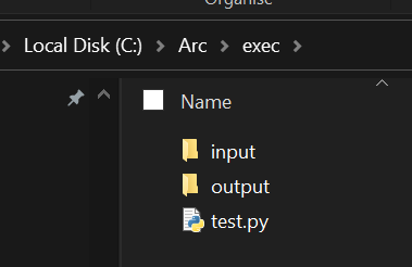 These two subdirectories will be managed by Arc service. Arc will put input and output json files into respective directories. The python scripts to be executed will need to be placed into the exec directory by the admin.