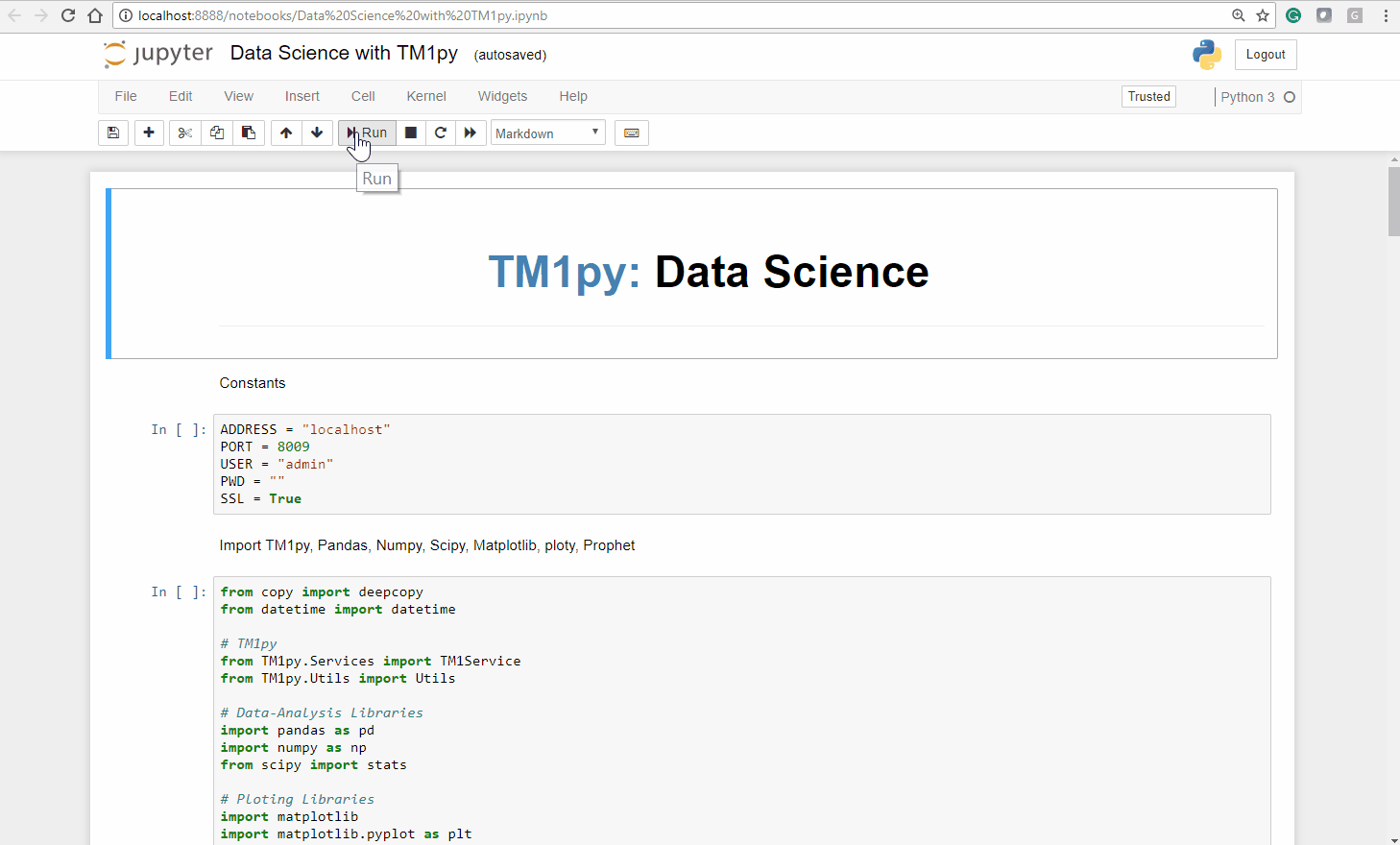 The first step is to define the TM1 connection settings which you find at the top of the notebook: