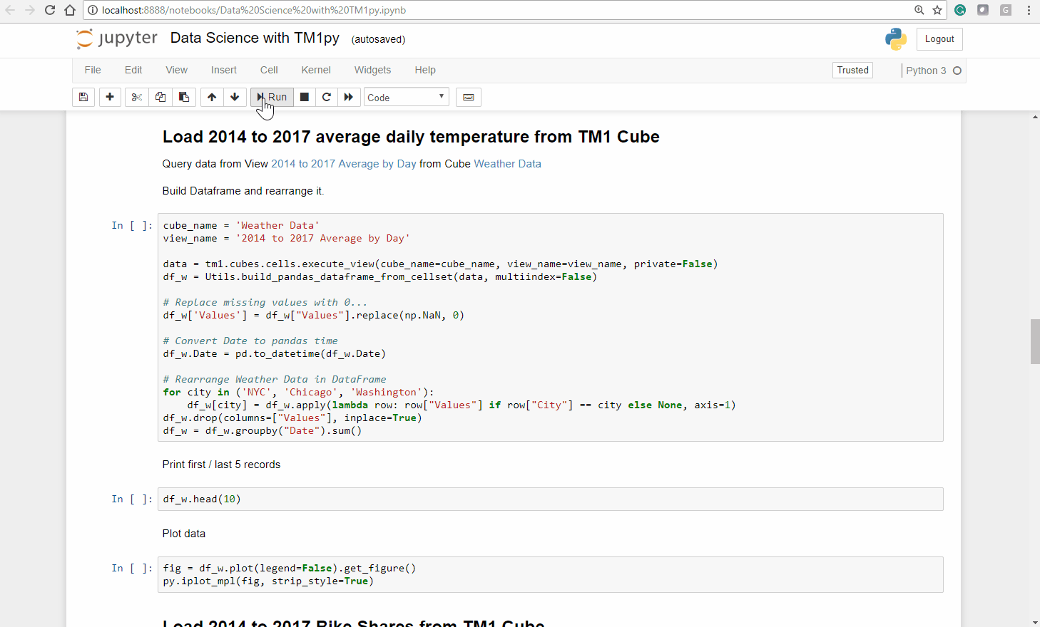 We created a Jupyter notebook to guide you through these steps. The notebook that we are going to use in this article is Data Science with TM1py.ipynb, you can find it in the cubike-sample.zip file which you can download in the Part 1 article.