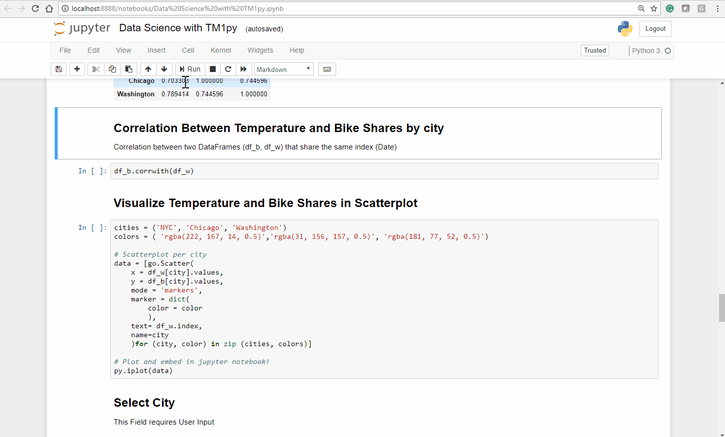To analyze the relationship between the average temperature and the bike shares by city, we need to query the daily historic average temperatures from our TM1 cube into python.