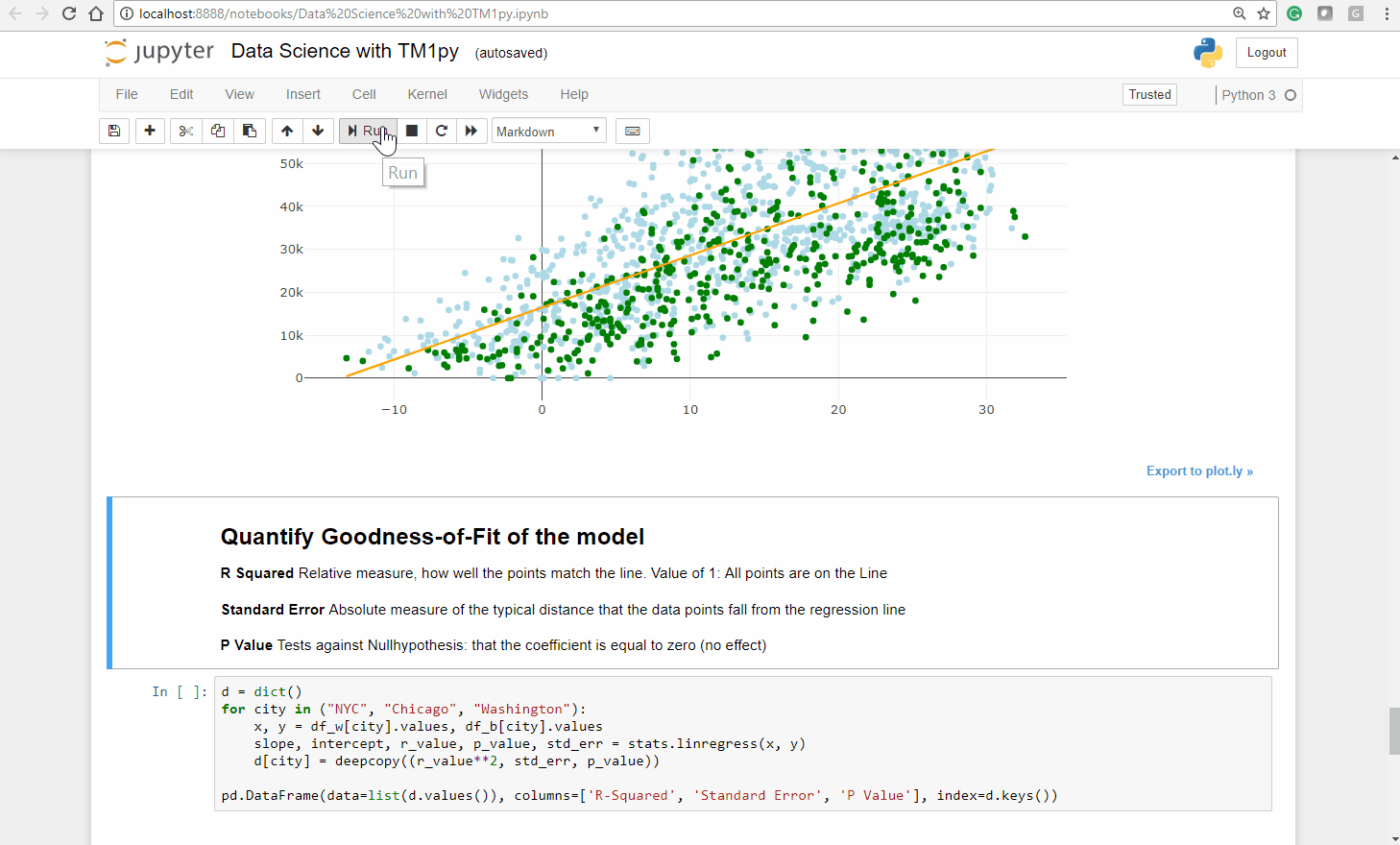 To calculate the fitted line we use the linregress function from the popular Scipy stats module.