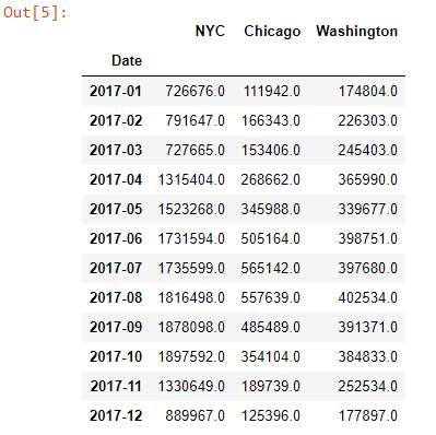 We now need to rearrange the dataframe. We need to reduce the dimensionality of our data from 4 (Time, Version, City, Measure) to 2 (Time, City). This should make our life easier down the road.