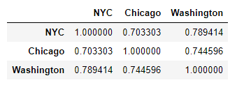 Pandas dataframes come with very handy and easy to use tools for data analysis. To calculate the correlation between the different columns (cities) in our dataframe, we can just call the corr function on our dataframe. df_b.corr():