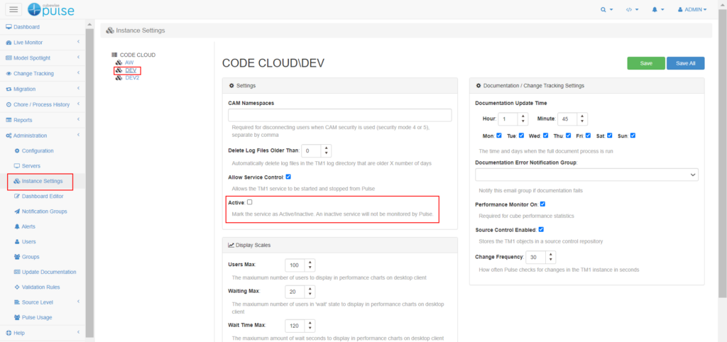 The documentation is Pulse’s backbone. Many features such as Change tracking rely on the documentation, when a new instance is set to Active, go to Administration > Update Documentation, pick a TM1 instance and click Document Selected Systems: