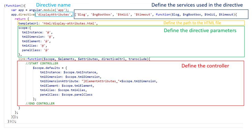 The link between the view (display-attributes.html) and the directive itself (display-attributes.js) will be defined in our JS file.