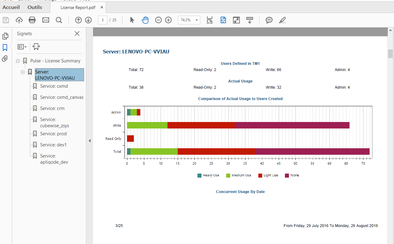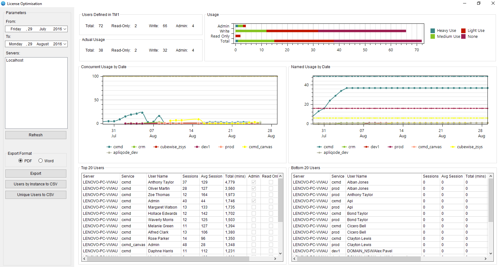 Pulse has specially designed report that gives you a summary of how the system is used by different types of users. This report gives you a full picture over any time-frame of how well utilized your licenses are. Users are categorized into Admin, Write and Read-Only roles and their usage mapped according to the amount of time they spend in the system and what they are doing.