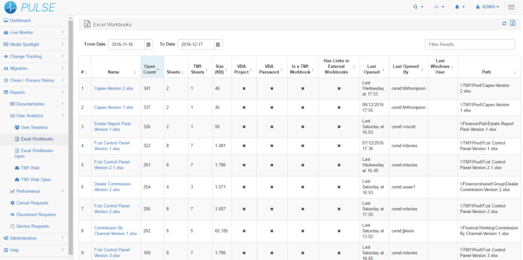Pulse keeps track of TM1 spreadsheets in both Excel and TM1 Web. If you want to know more about User Analytics or Excel Analytics with Pulse just click on the links.