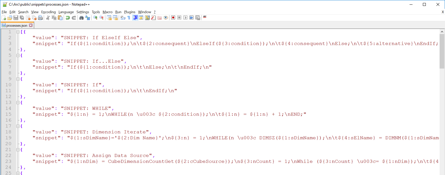 You don’t have to create the four files, if you just want to overwritte the snippets for the TM1 processes, you should just create public/snippets/processes.json file.