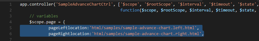 In this sample the name of the pages “pageLeftLocation” and “pageRightLocation” are defined in the associated JS file js/controllers/sample/sample-advance-chart.js: