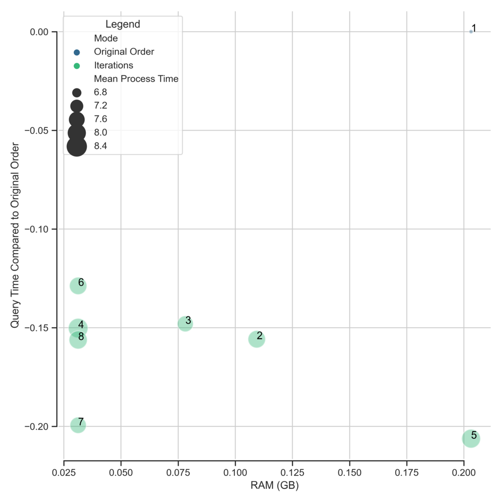 OptimusPy is a Python script that leverages TM1py to find the ideal dimension order for your cubes. The tool will swap dimension orders until it finds the order with the best query speed and the smallest memory footprint. This is ideal for traceability and custom analysis because it then visualizes the results in a CSV file and a scatter plot per cube, like the one you see below. You can read more about it here.
