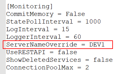 Once copied, you will have to update the Pulse.cfg in DEV2 with ServerNameOverride=DEV1. By doing so Pulse will now run on the DEV2 server using actually DEV1 as a server name. The ServerNameOverride parameter is located in the Monitoring section: