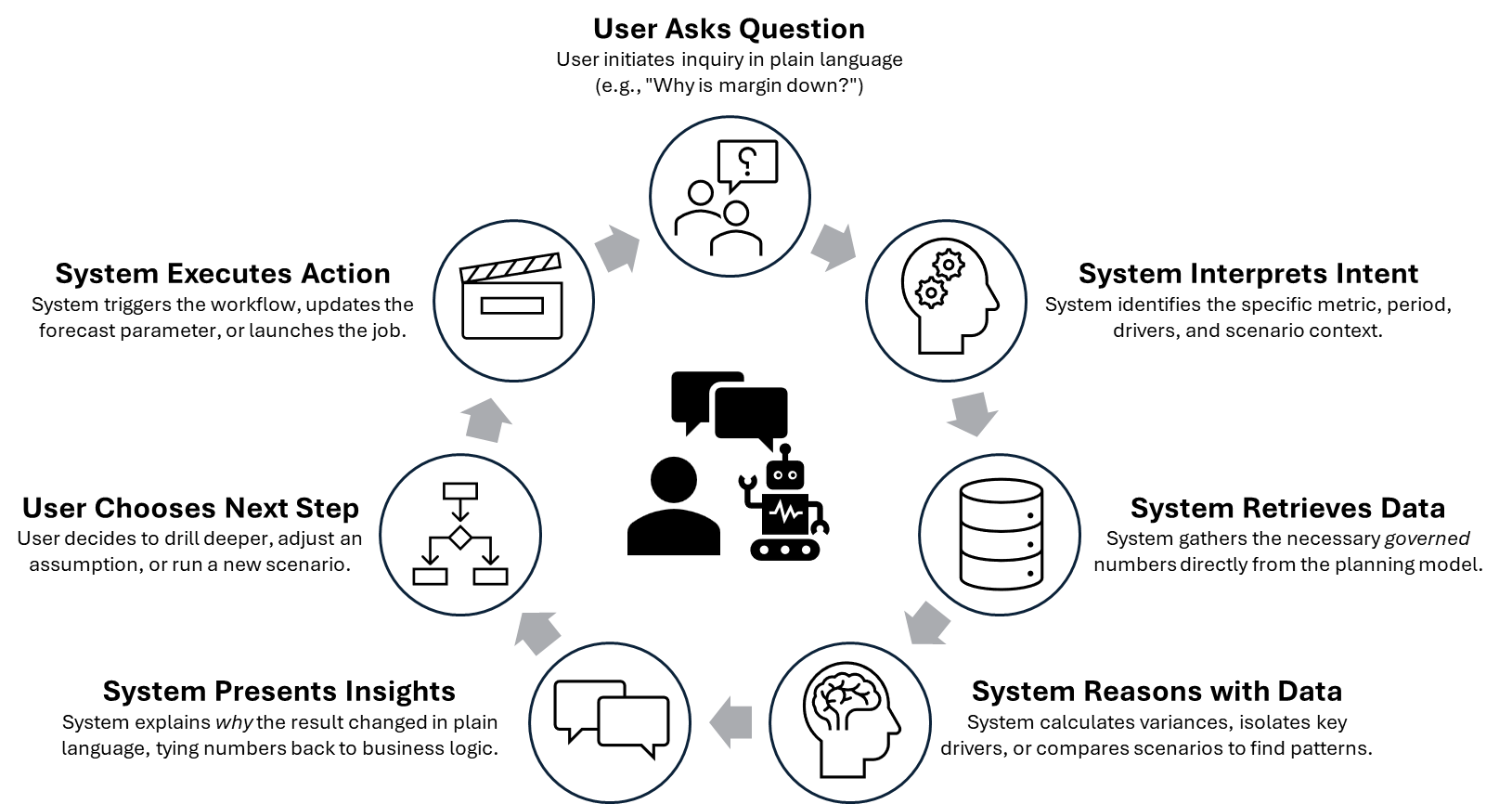 Natural language helps people get answers and understand the logic behind them. The next step is using the same intent to coordinate work across systems. Instead of asking for an explanation or a driver change, a user might ask the system to launch a scenario workflow, update a cost forecast, route an approval, or synchronize data across tools.
