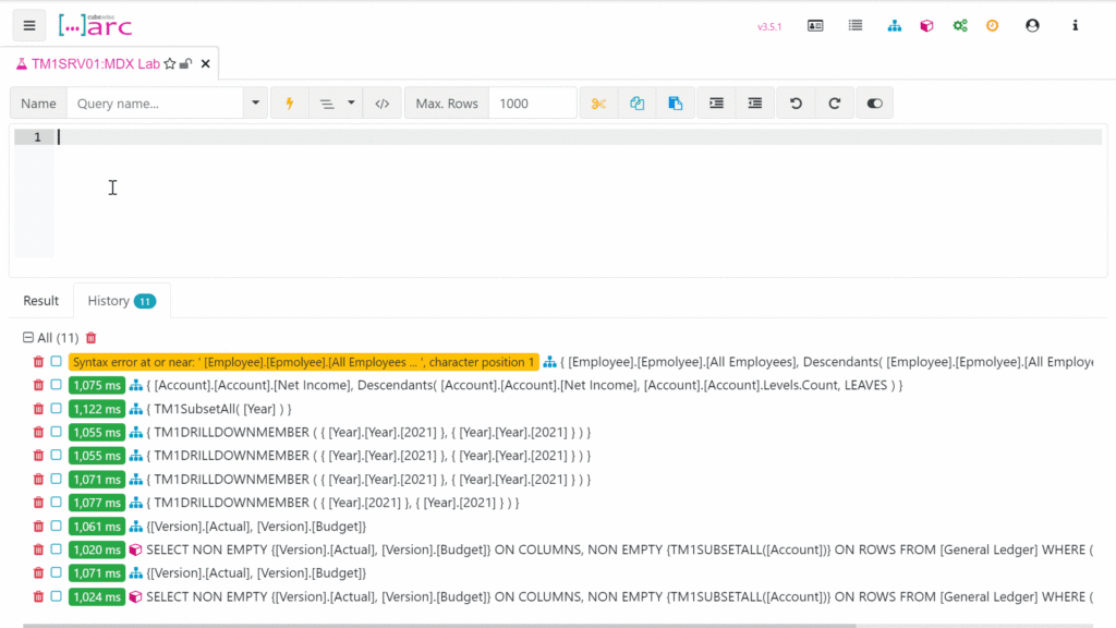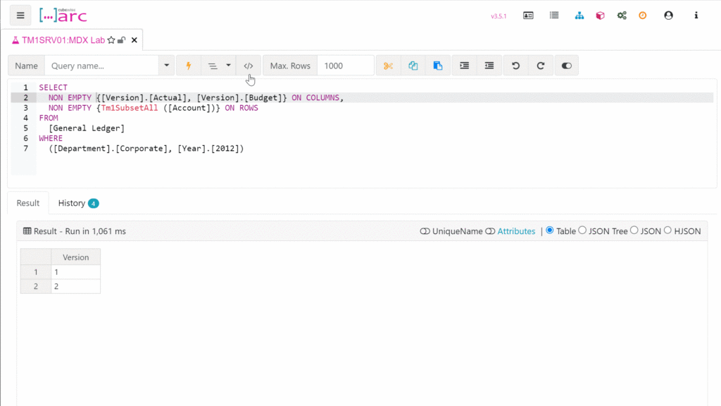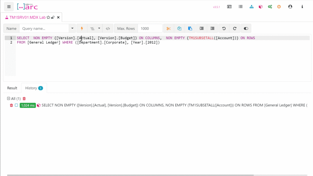 Arc supports code formatting for Processes, Rules, and MDX. In the MDX Lab, just copy any MDX query, and then click the Format Code button and you will see your query formatted with the correct case and spaces. In addition, you can fully customise this feature by adding your own best practices, allowing you to enhance your queries in a very efficient way.