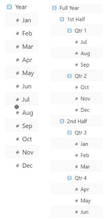 Until the arrival of Planning Analytics, what was commonly called a “hierarchy” in TM1 was simply a specific roll-up of C and N level elements in a dimension. For example, in a “Period” dimension, the same N-level elements could roll up to multiple C-level elements, with the roll-ups having names like “Full Year” and “Jun YTD”: