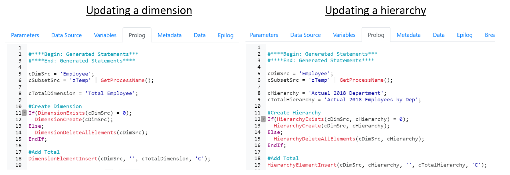 In the example below, the TI code on the left creates a dimension and on the right it creates a Hierarchy – you can see they are very similar: