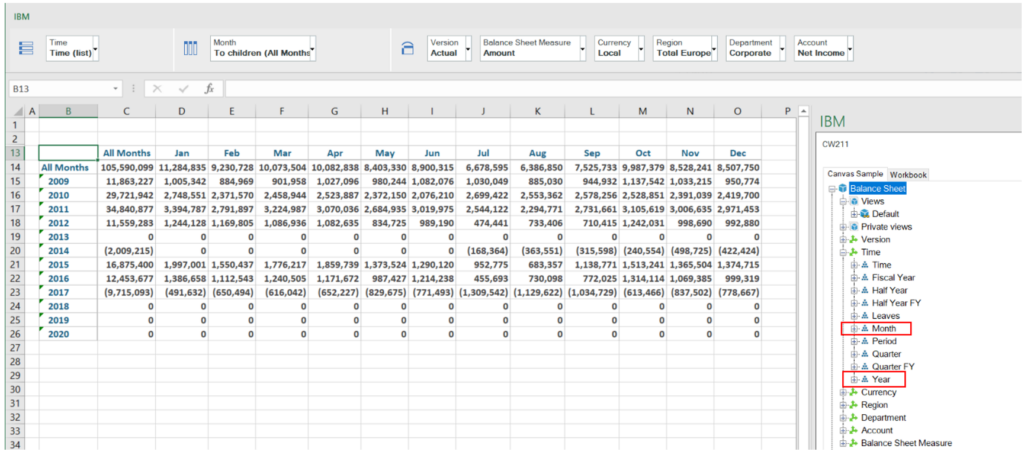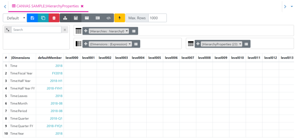It should be noted that in this cube view, hierarchies are treated as “virtual” dimensions (Time, Time:Fiscal Year, Time Half Year…). If you use levels in PAx or Cognos Analytics, this is where you will define them. To apply the changes, you must run the RefreshMdxHierarchy process function.