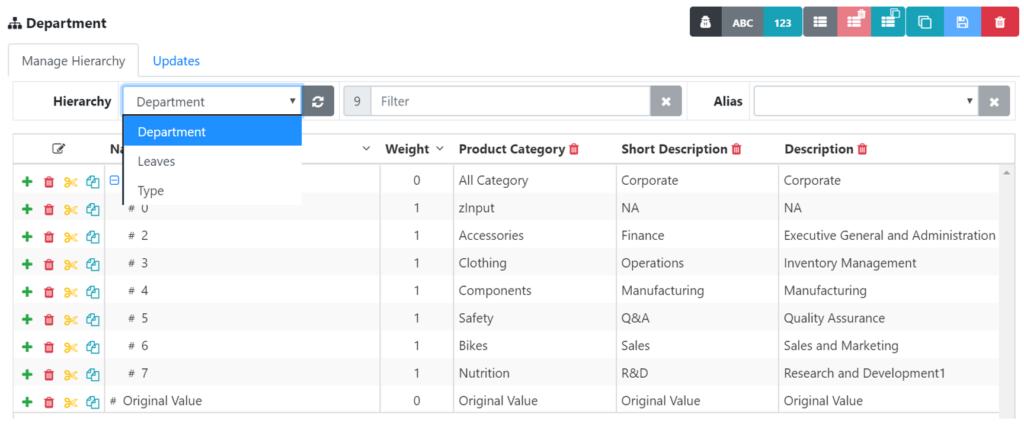 After creating your first Hierarchy, the “Leaves” Hierarchy will be automatically added to the list of available Hierarchies. In the example below, the “Type” Hierarchy has been added to the Department dimension, and three Hierarchies (“Department”, “Leaves” and “Type”) are now available: