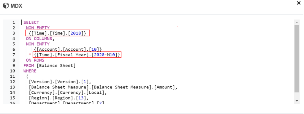 To reference an element in a Hierarchy in MDX, you must specify the Hierarchy name in your query, for example, instead of [Time].[2018] you will need to use [Time].[Time].[2018] to specify element “2018” from the default Hierarchy (remember, the default Hierarchy has the exact same name as its containing dimension).