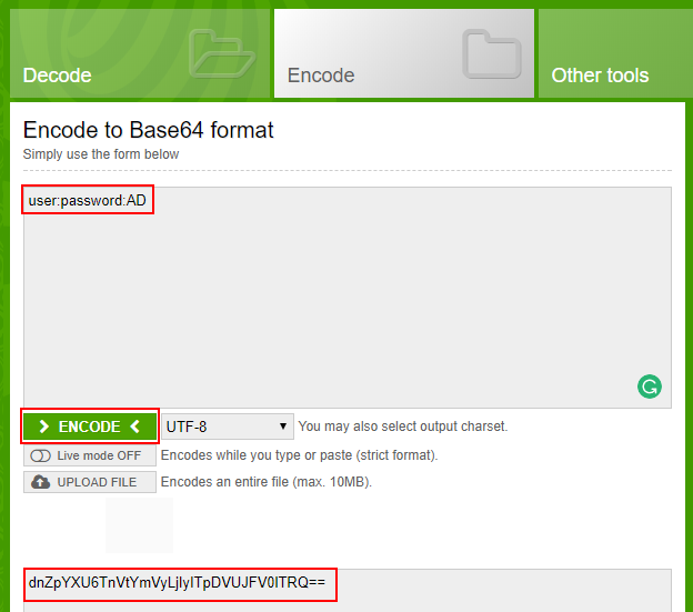 First what you need to do is to encrypt your CAM user password. To do that you can use sites such as the base64encode.org website. Click on the Encode tab and type user:password:AD and then click Encode, it is going to encode the string:
