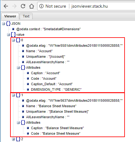 As you can see above, in the browser the JSON format is not easily readable but do not worry there are lots of tools online which can help you to format it. For example, if you copy the content from the browser and paste it into the JSON viewer, in the viewer tab you will see the data structure: