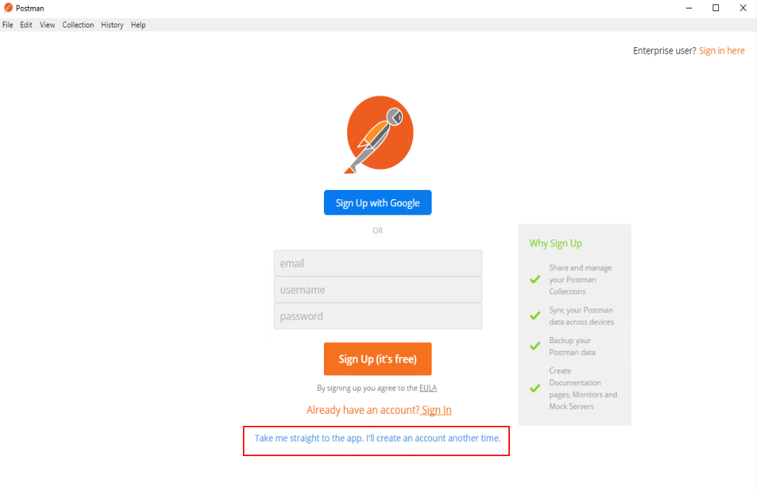 Postman will start and it will ask you to sign-in. You can choose to create an account or to click on “Take me straight to the app”. The advantage of signing up is that Postman will save your work in its cloud and you will be able to retrieve your work on another laptop after you have signed in.
