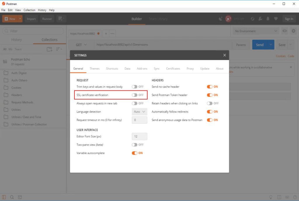 Ater clicking the Send button if you get the error as above you might have to turn off SSL. To do that, go to File then Settings and un-check Postman’ SSL certification verification: