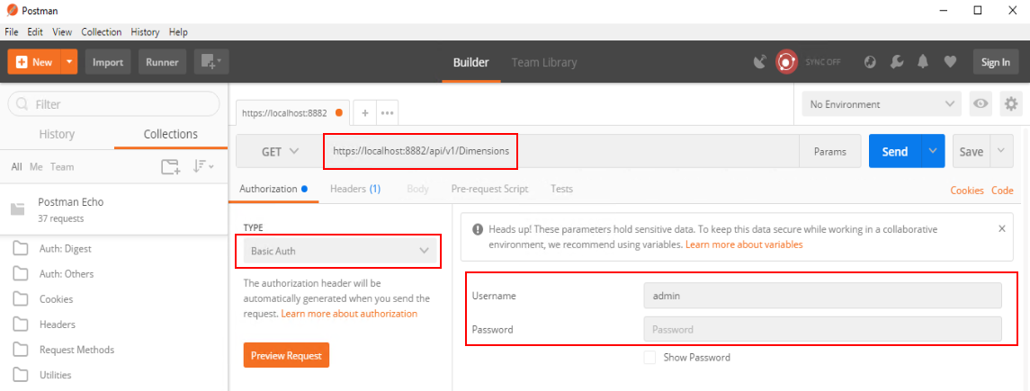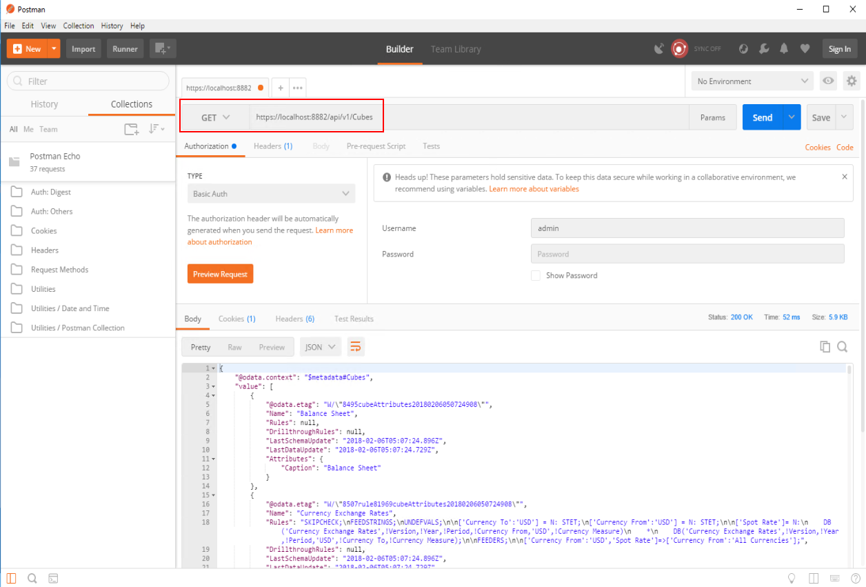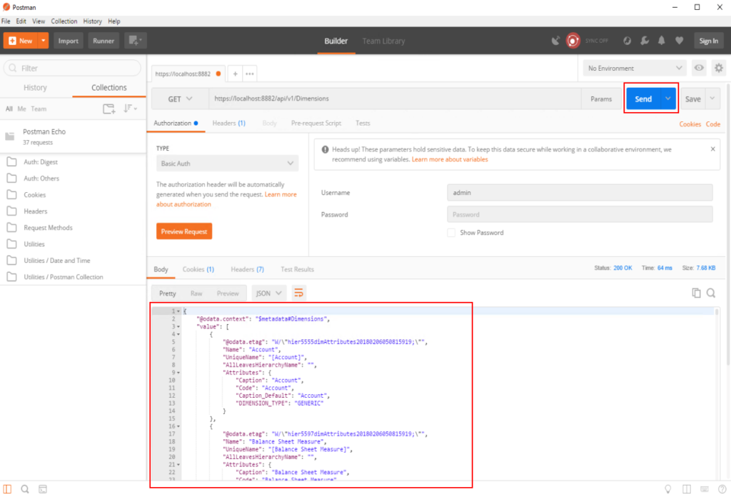 In this example the TM1 instance uses the basic TM1 Security with user admin and no password. In the authorization tab, we select Basic Auth and then we input username and password. Click the Send button to run the query: