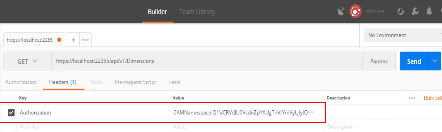 In the headers tab, add a new key with Authorization and as value CAMNamespace + the Base64 format encoded authentication