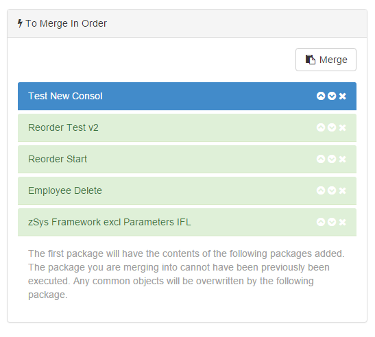 The merge package page lists all of the packages and provides a panel on the right that has the order in which one or more packages are merged. The first package in the list is where all of the subsequent packages will be merged into, the target. Only packages that have not been executed can be the target package. This is to ensure that the history of execution matches the contents of the package. If the package has already been executed it will be displayed in pink to show that it is invalid and can’t be merged.