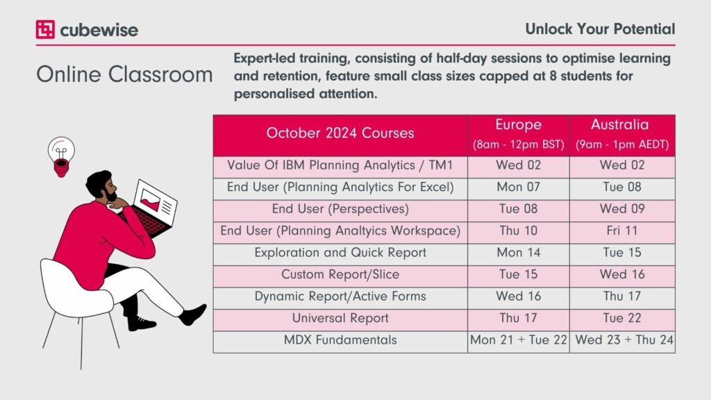 Looking to enhance your IBM Planning Analytics expertise? Our half-day online sessions are designed to fit perfectly into your busy schedule, allowing you to learn without interrupting your workflow.