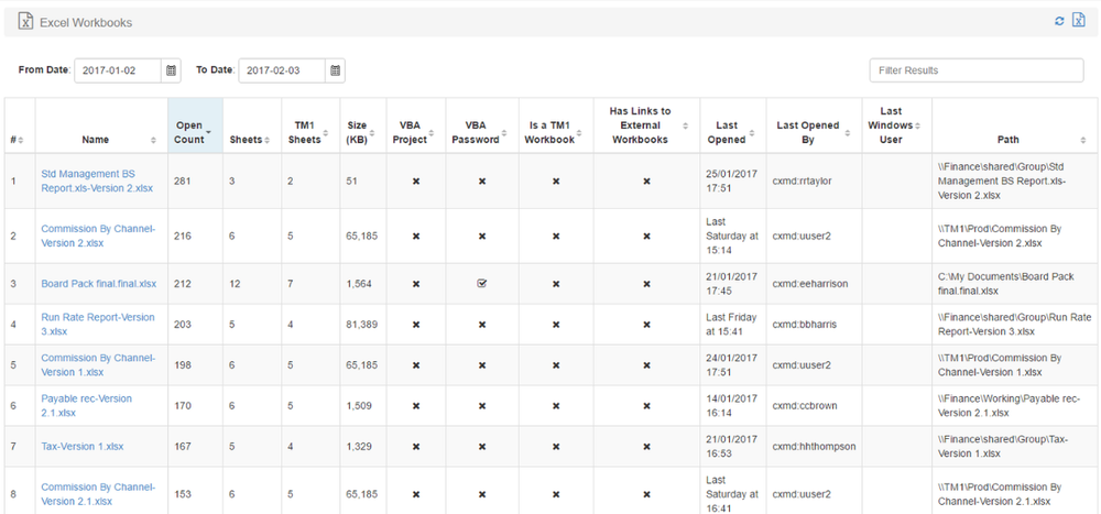 Being able to see the use or lack of use of a cube enables us to understand better our users needs. If we have excessively large workbooks which should really be a database and Excel should not be used, we know that we are either not fulfilling our users’ needs or there is a lack of understanding as to how to use what is built. Similarly if cubes are unused then we are able to find out why and either make improvements or provide training.