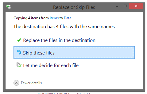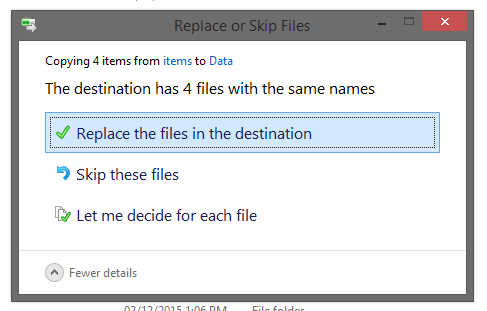 Copy the contents of the dependencies to the target Data Directory. If the dependency exists chose to skip the file.