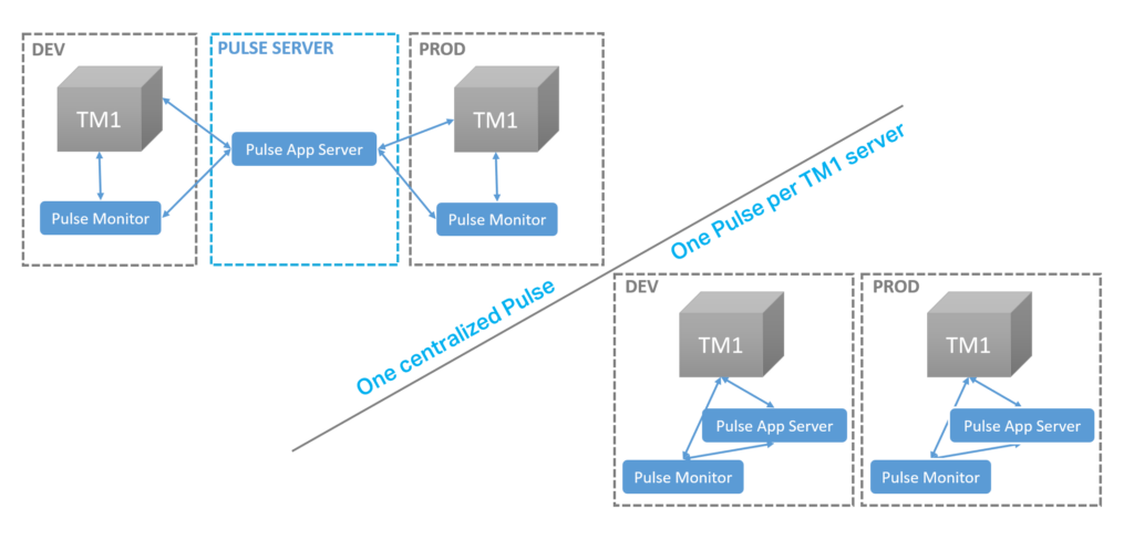 When working with multiple TM1 servers, you can choose between installing one Pulse 6 server that will monitor many TM1 servers or installing Pulse 6 on each server: