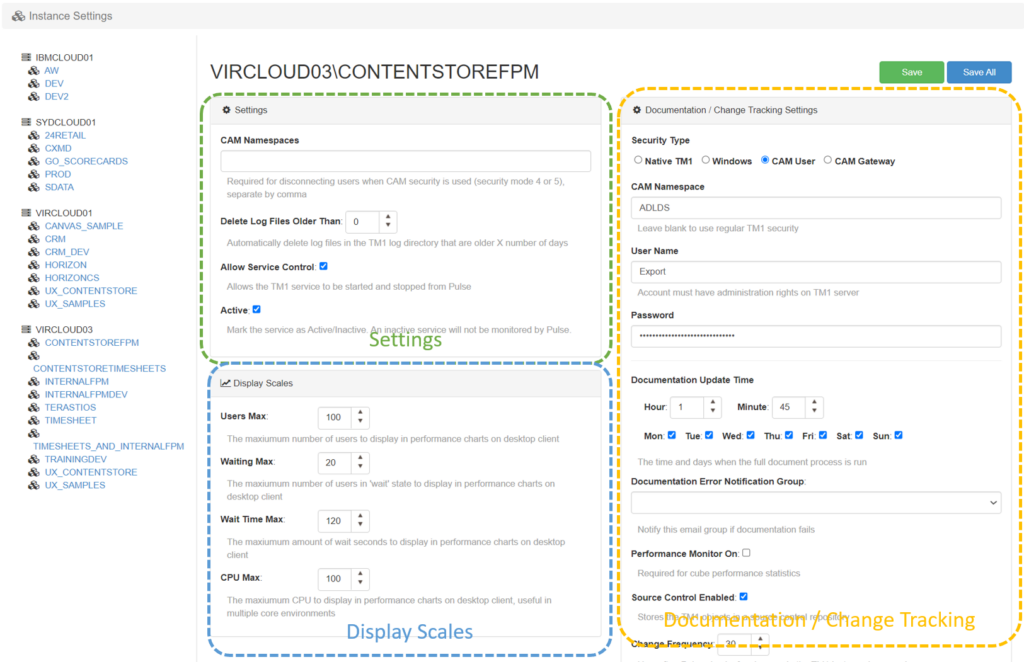 The instance settings need to be entered for each TM1 instance, the page can be split into three sections: Settings, Display Scales and Documentation / Change Tracking: