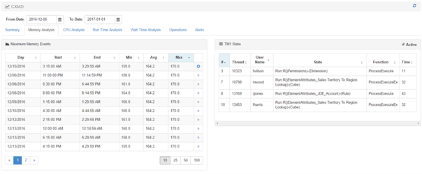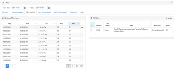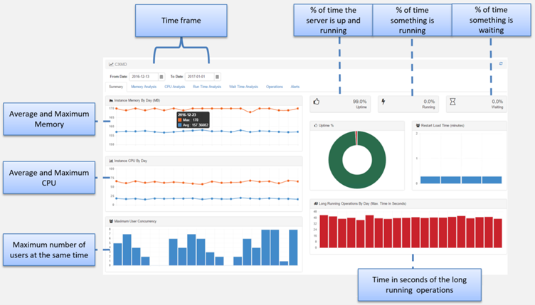 The two following tabs are similar to the ones in the performance server report but only focused to the CXMD instance.