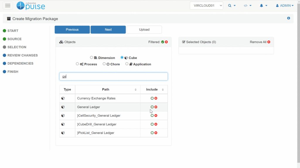 The dependency engine adds any objects required by the items you have included, such as picklist cubes, drill cubes, security, etc. This ensures that you’re capturing and migrating all the key components – including those that you may have forgotten.