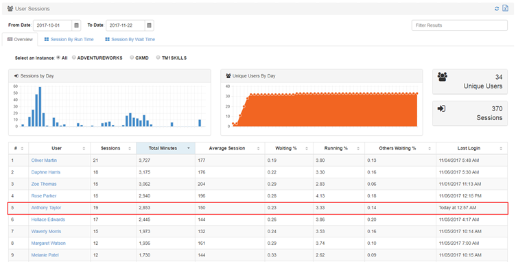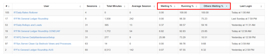 Pulse keeps track of every user’s sessions. For each user you can see how many % of their time they spent waiting, in the example below, we can see that they all spent less than 1% of their time waiting which is not too bad: