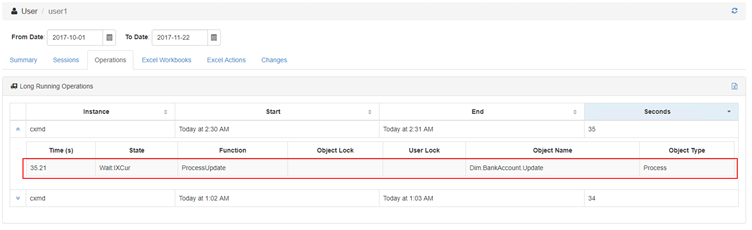 In the operation tab, you can see the details of all operations for a specific time frame. If you click on the left arrow you see exactly what was happening. In the example below you can see that it took 35 secs for a TM1 process to run: