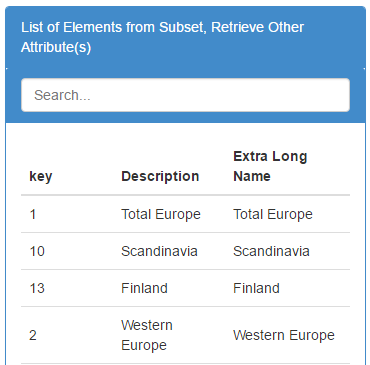 If you want to retrieve attributes other than “key” and “alias”, you will need to add a new parameter named tm1-attributes in the tm1-ui-element-list directive, which will contain the list of attributes you want to show. In the example below we’re going to use attributes “Description” and “Extra Long Name” from the Region dimension:
