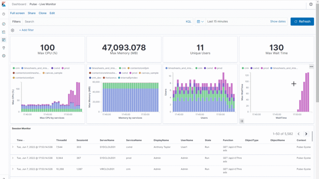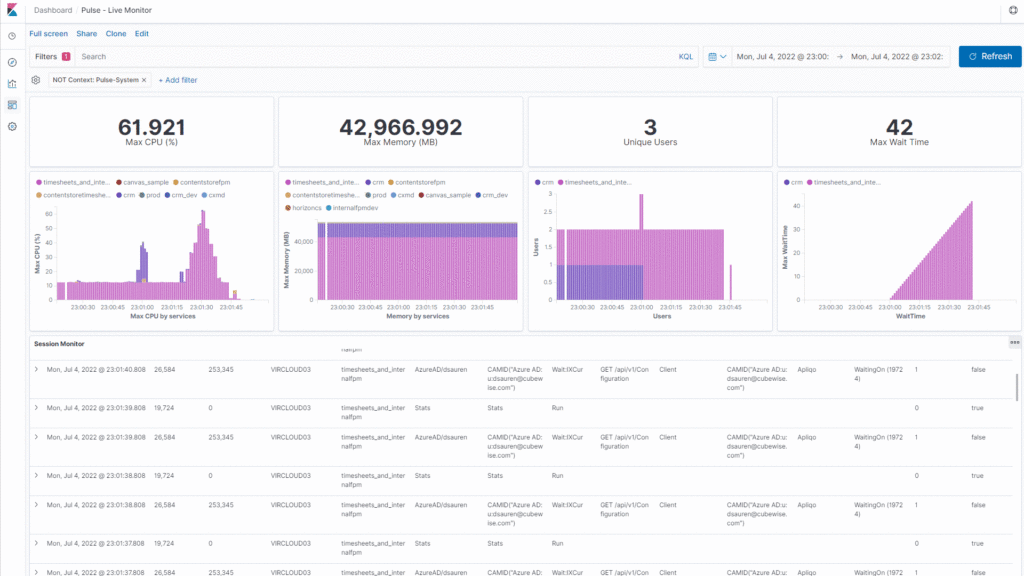 With the Pulse Explorer, you can rewind the state of your application at any time. This means that you can see who was logged in 2 hours or 2 days ago, what they were doing, and what was running – to help you diagnose a potential problem.