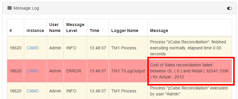 In the example below if the value is not the same between the General Ledger and Retail cubes, a message will be written the message log: