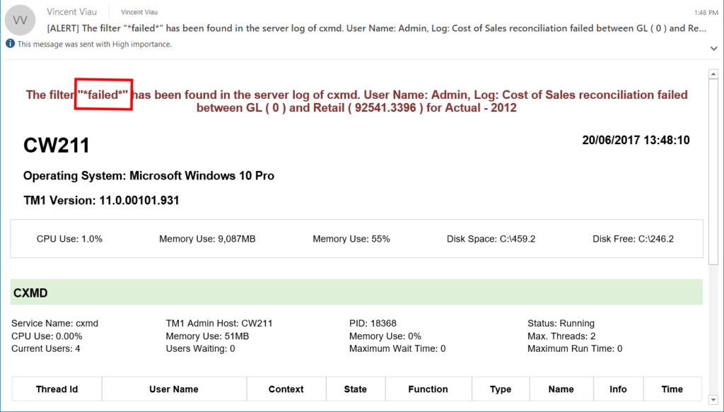 The email alert will report that the text pattern “failed” has been found within the message log and will also include a snapshot of the instance’s TM1Top data: