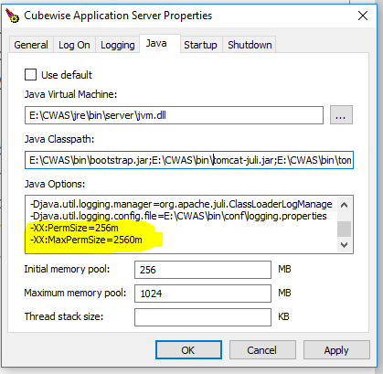The default allocation is 64Mb. There will be cases however that you will have encountered an OutOfMemory error, where PermGen will be indicated on the log file. On situations similar to these, you can add another parameter to increase this PermGen by appending the following into the Java Options: