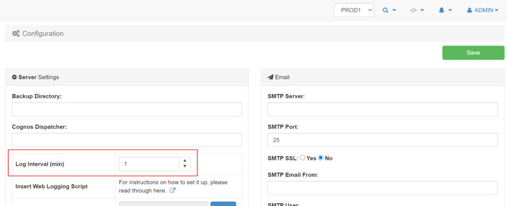 To reduce the number of minutes Pulse keeps in the browser’s cache, you can update the Log Interval (min) setting from the Configuration page (Once updated, click the save button):