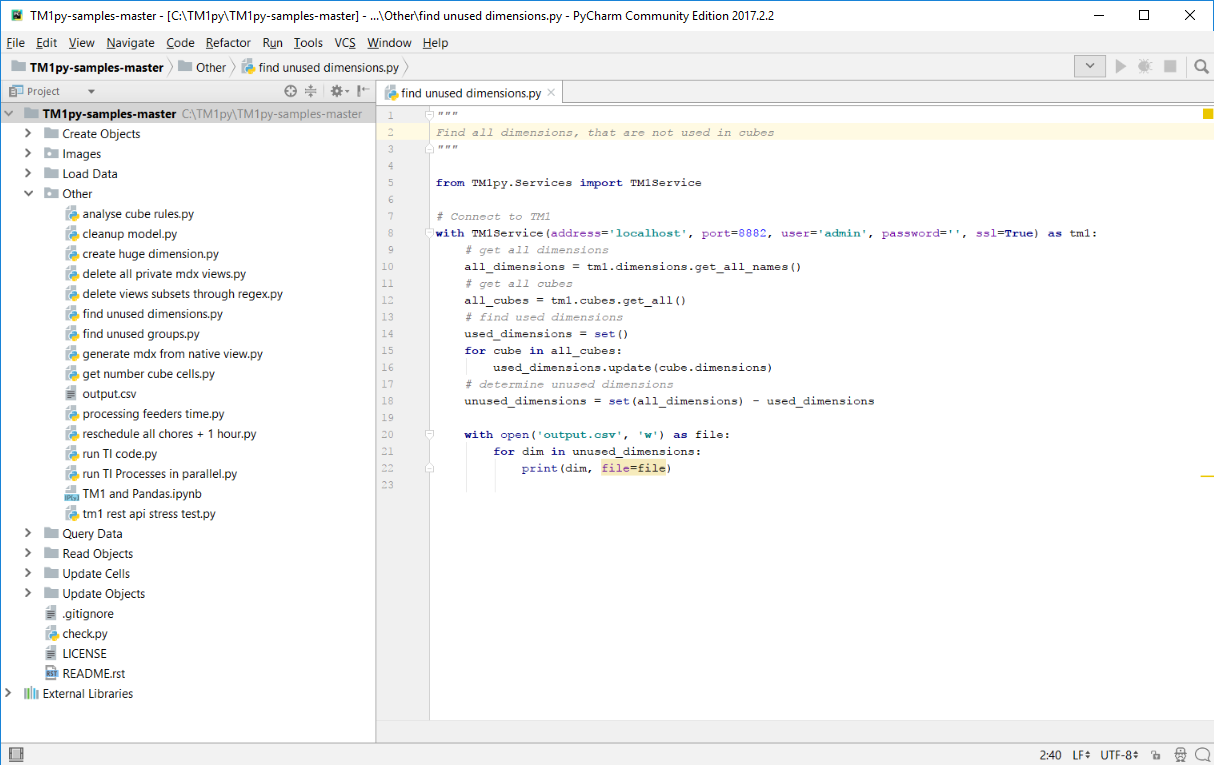 Once downloaded and installed with the default settings, you just need to locate the folder where you have downloaded the TM1py samples: