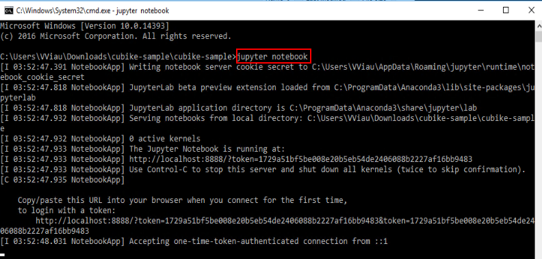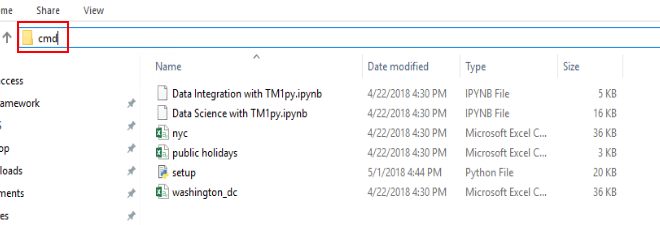 To open Jupyter Notebook, you need to run Jupyter. To open a Windows command prompt, go to the folder location where you downloaded the Cubike example and then in the Windows Explorer bar, just type cmd and press enter: