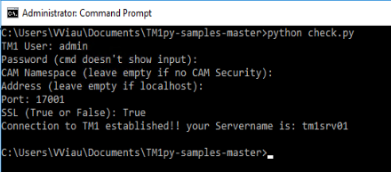 After running the check.py script from the TM1py samples, TM1py should be able to find your TM1 instance name: